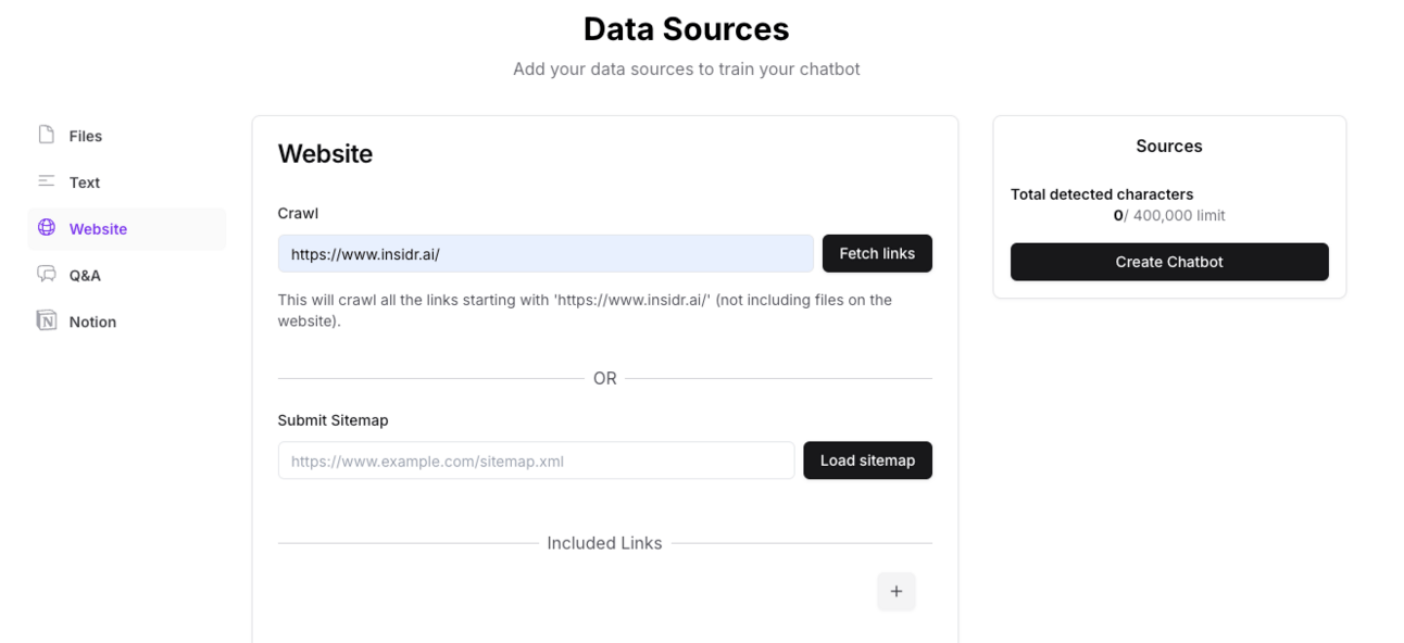 For the example we just included 1 link from our website: https://www.insidr.ai/ai-tools and we have a chatbot ready. You can now click Connect and Make Public, and then deploy on your website, and even connect with other apps.